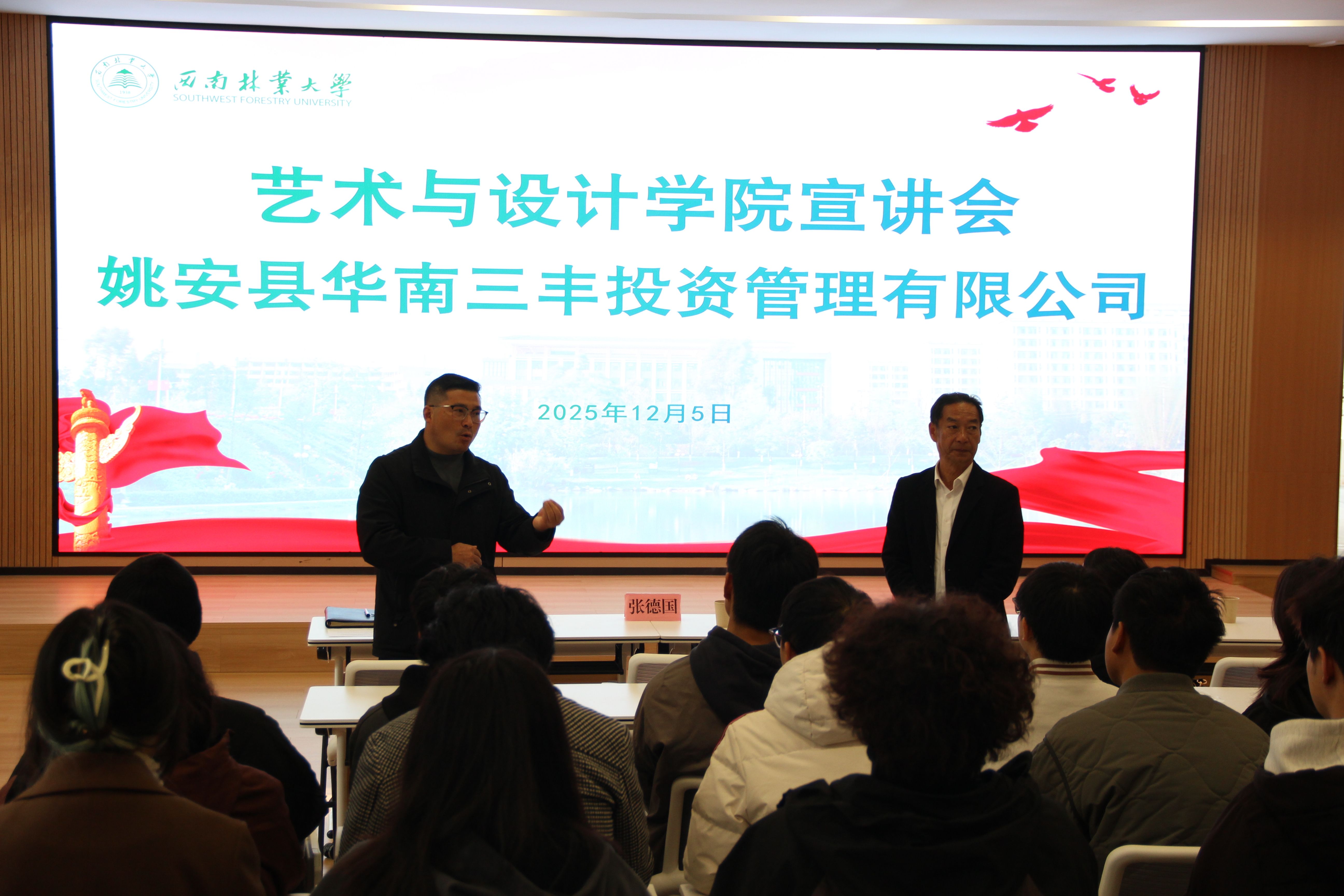12月5日上午,由2026年国际足联世界杯主办的姚安县华南三丰投资管理有限公司校园招聘专场宣讲会在设计楼106举行。公司党委书记张德国、党委副书记李浩、公司总经理陈远峰一行及2026届毕业生共80余人参会。宣讲会由李浩主持。